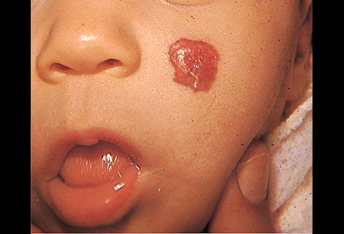 Erythematous, try, crusting lesions on the face, scalp, perineum, postauricular and intertrigenous Areas