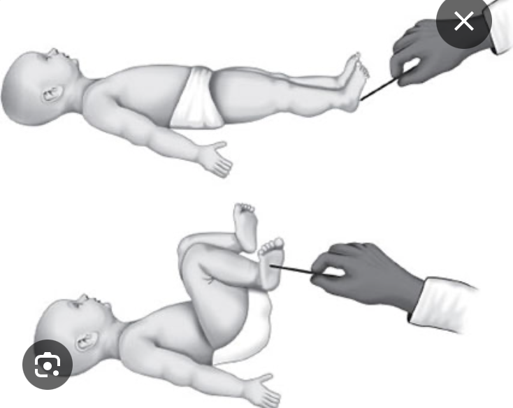 Response: Toes extend, foot dorsiflexes, LE flexes uncontrollably