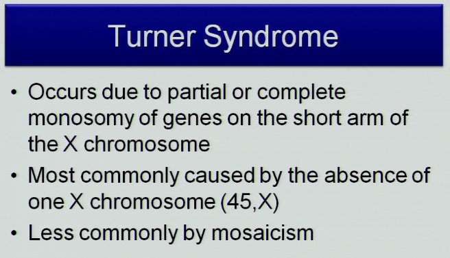 Turner syndrome occurs due to partial or complete monosomy of genes on the short arm of the X chromosome