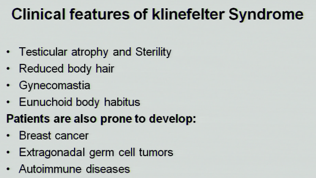 list the clinical features of Klinefelter syndrome