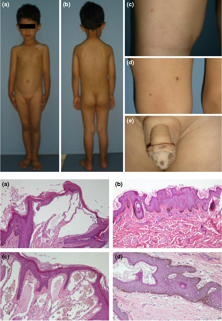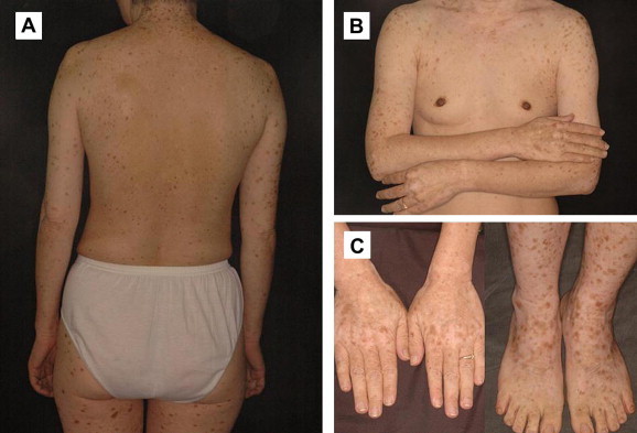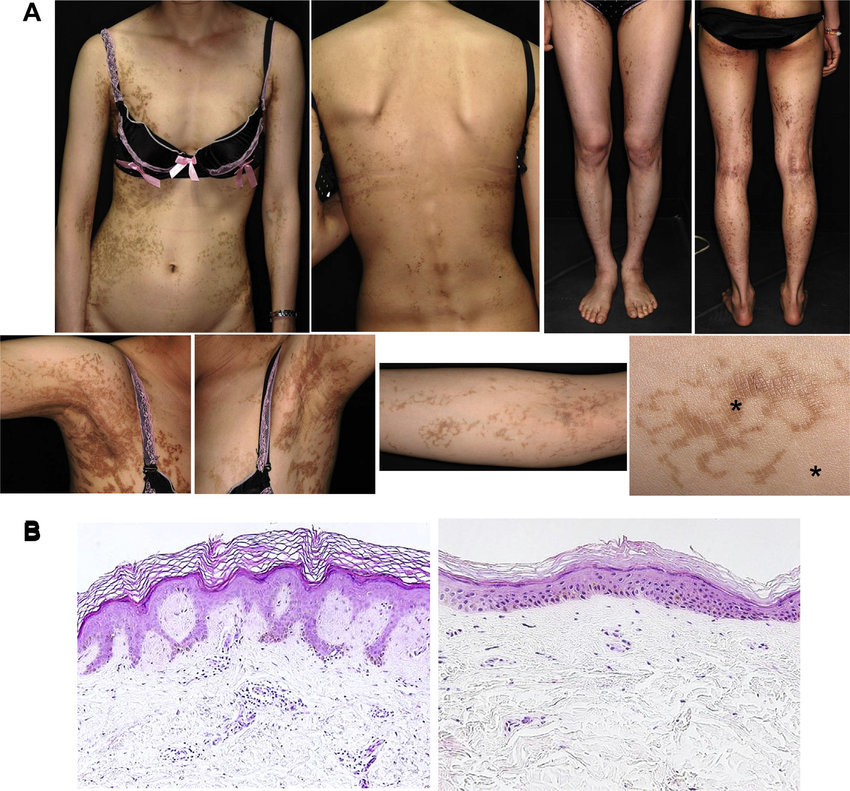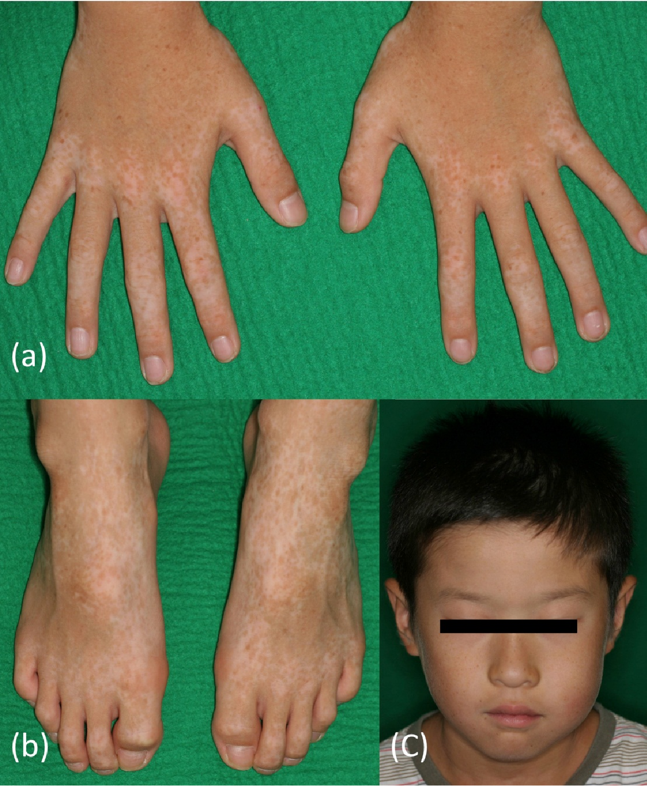 Presents by 6yo with dyschromia, hyper and hypopigmented macules on face and dorsal aspect of the extremities