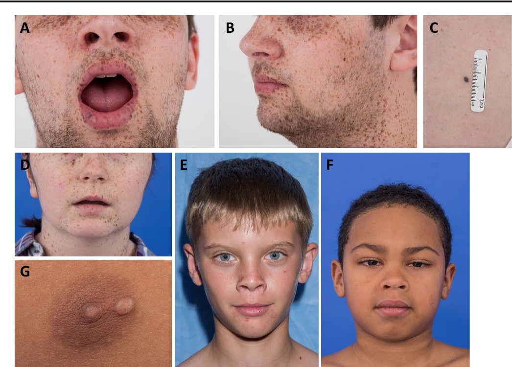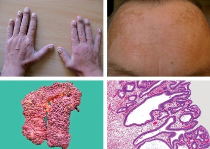 Skin: pigmented macules on lips, buccal mucosa, genitals, melanonychia in 50%