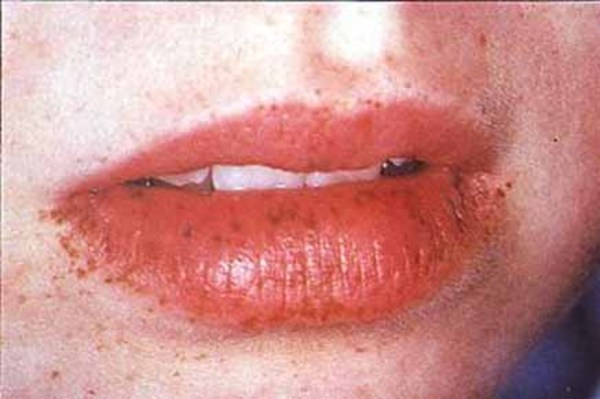 Pigmented macules on lips, digits, and other mucosa by age 20
