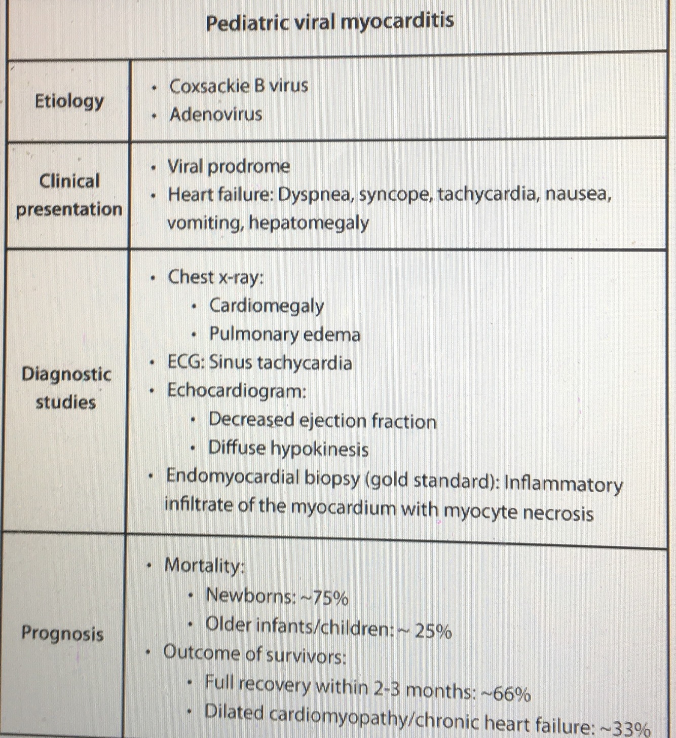 What should you always suspect in a pediatric pt who recently had a viral illness, now p/w SOB and cardiomegaly?