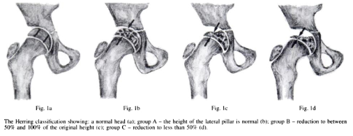 Lateral Pillar of capital femoral epiphysis during fragmentation stage. 6 months after onset of symptoms, base on height of lateral pillar of capital femoral epiphysis on AP pelvis.