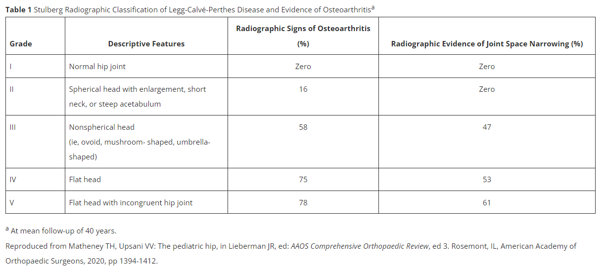 The Stulberg classification is the most widely used system for outcome measurements and correlates with degenerative changes at long-term follow-up. The classification system is based on femoral head sphericity and joint congruency at skeletal maturity.