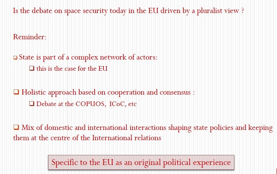Is the debate on space security today in the EU driven by a pluralist view?