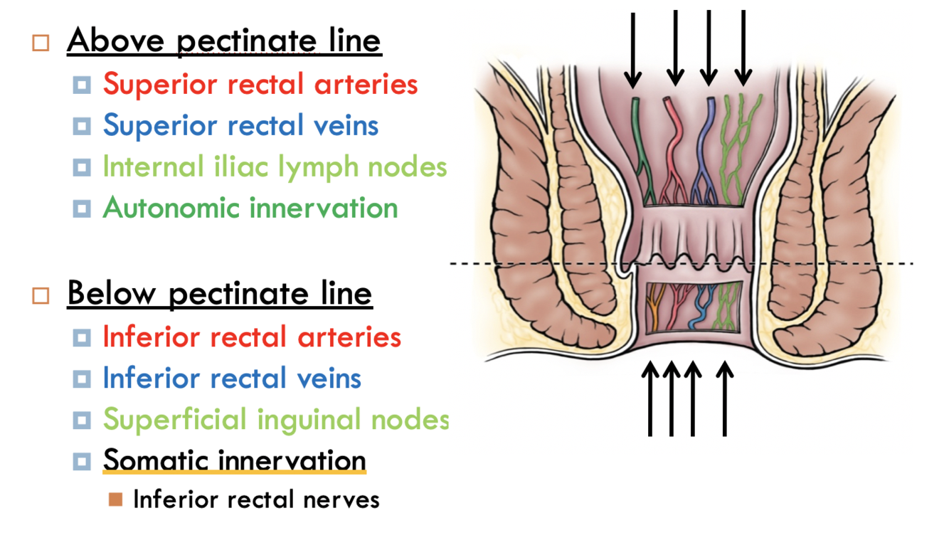 Blood supply, lymphatics, and innervation below and above pectinate line