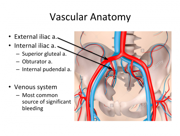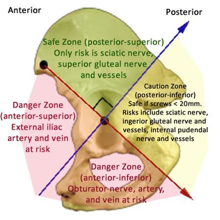 No screw in anterior zones (anterior superior has external iliac artery/vein, anterior inferior has obturator nerve, artery, and vein. Posterior superior is safe zone, watch for sciatic nerve, superior gluteal n,a,v Posterior inferior is secondary safe zone. Watch for sciatic nerve, inferior gluteal n,a,v, and internal pudendal n,a,v
