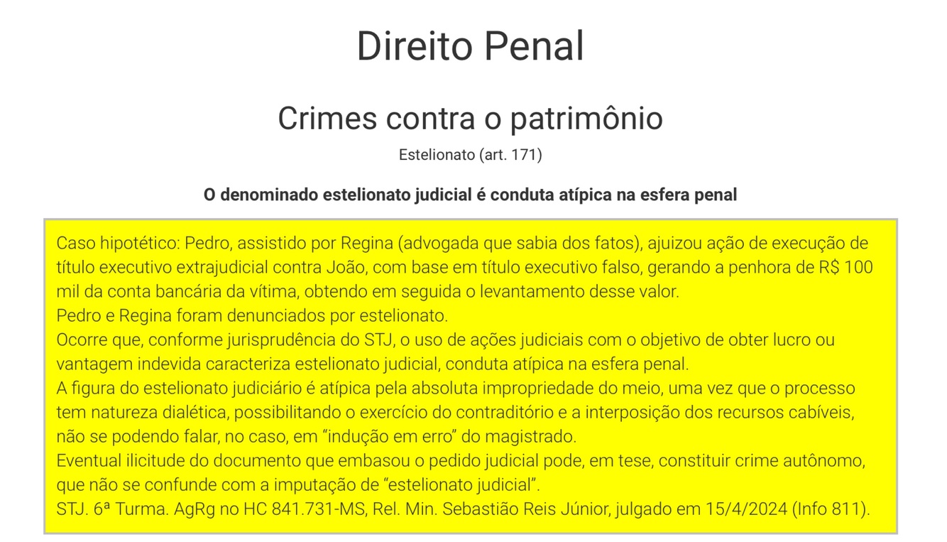 Estelionato judicial se dá quando o agente, mediante documentos ou alegações falsas, entra em juízo com o objetivo de obter lucro ou vantagem econômica em prejuízo alheio.