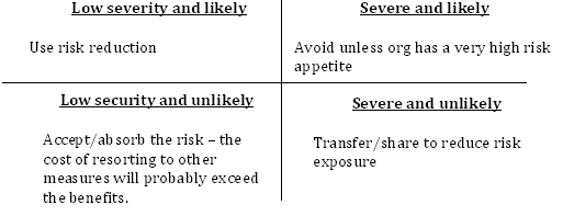 Having assessed the probability and impact of the risk, the org can move on to decide how best to mitigate them on an ongoing basis, by continually monitoring risk. This can be done by categorising them according to an impact and probability grid: