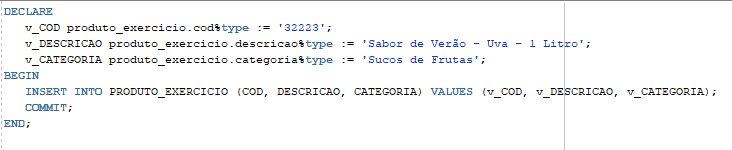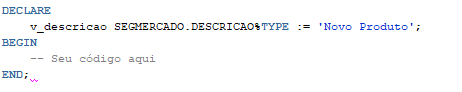 Como declarar uma variável v_descricao que tenha o mesmo tipo da coluna DESCRICAO da tabela SEGMERCADO e atribuir o valor ‘Novo Produto’ a ela?