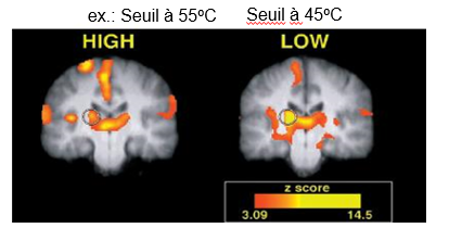 L’activation cérébrale des structures associées à la perecption algésique est similaire lorsqu’évoquées au seuil subjectif, malgré que l’intensité du stimulus soit différente (55 et 45 degrés)