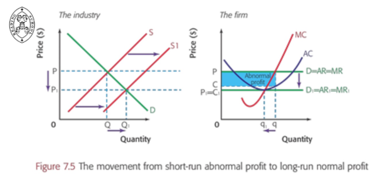 This is the only diagram possible for a firm in the long run. The reason being, is because supernormal profit provides a signal (as a result of perfect information) and an incentive for new firms to join the industry. Thins inflow of new firms entering the market cause a shift to the right of the supply curve of the industry. Industry supply increases -> market price falls -> firms in the industry will receive a lower price and will earn a normal profit, where TC=TR: AR=AC