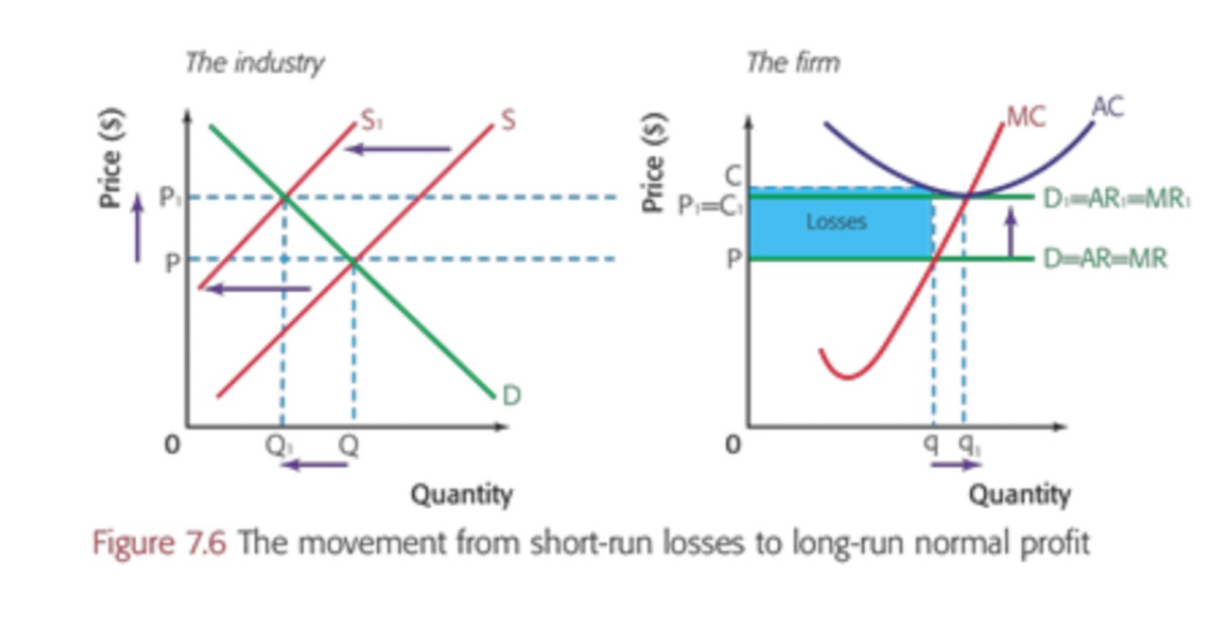 Therefore, industry supply falls in the long run and the market price increases. Firms remaining in the industry will receive a higher price and will earn a normal profit: TR=TC; AR=AC
