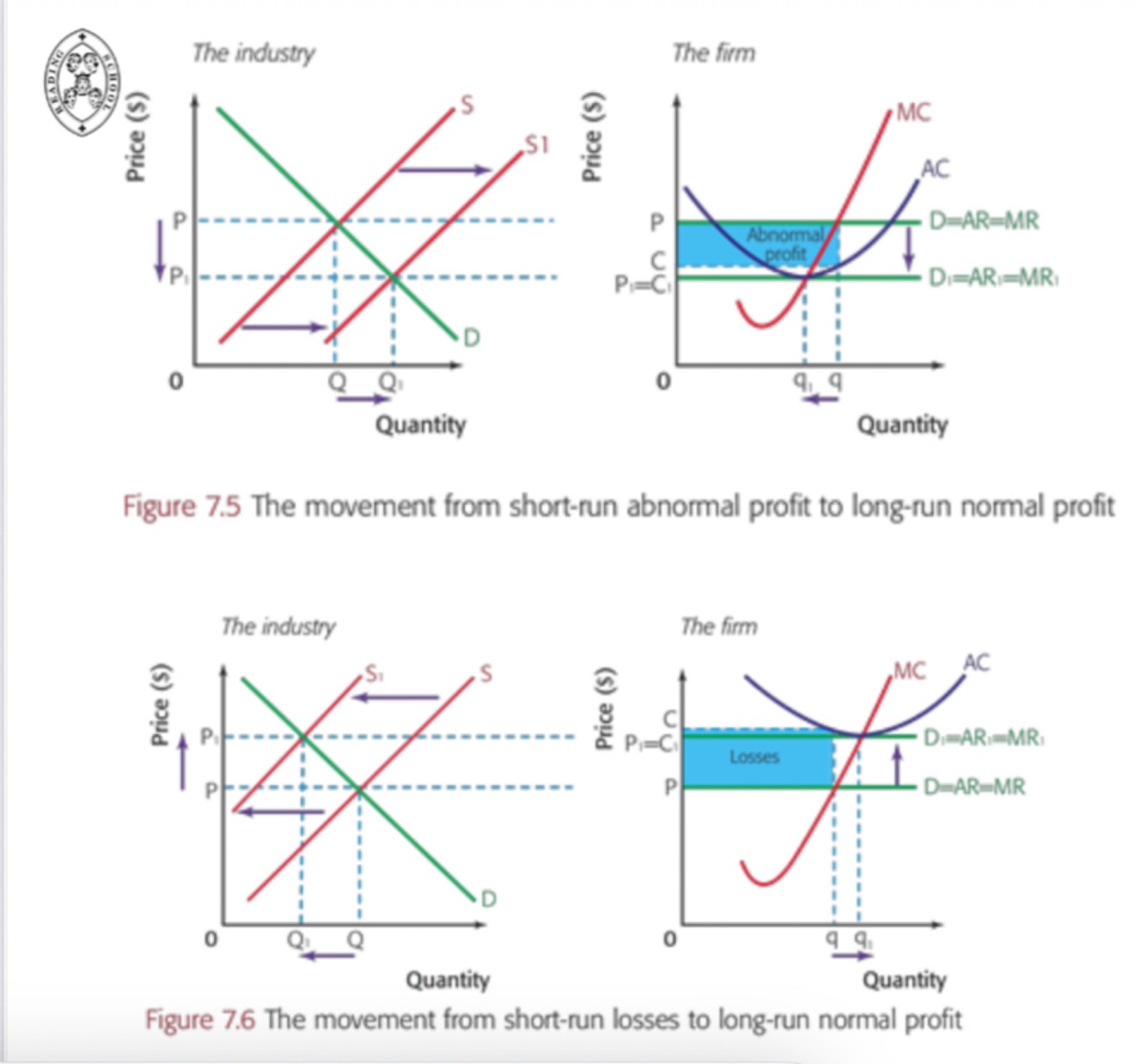 Economics losses provide signals (because of perfect infromation) for firms to leave the industry. They may choose to earn supernormal/normal profits in other markets (free exit). There is a shift to the left of the industry supply curve.