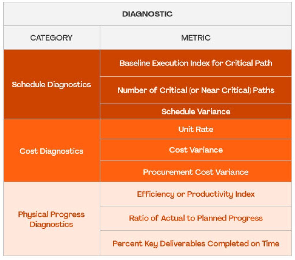 Diagnostic metrics (schedule diagnostics, cost diagnostics and physical progress diagnostics)