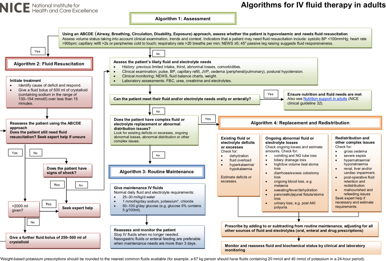 Obese: adjust the IV fluid prescription to their ideal body weight. Use lower range volumes per kg (patients rarely need more than a total of 3 litres of fluid per day) and seek expert help if their BMI is more than 40 kg/m2.