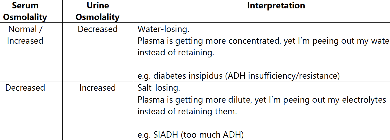 What would the osmolality be if you are salt losing, what would it be if you are water losing?
