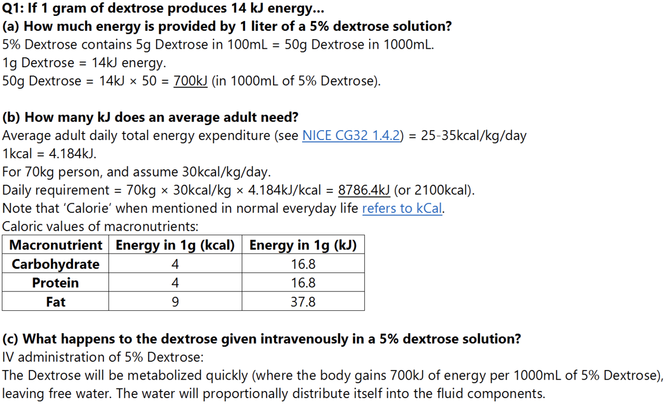 Q1: If 1 gram of dextrose produces 14 kJ energy. How much energy is provided by 1 litre of a 5% dextrose solution? How many kJ does an average adult need? What happens to the dextrose given intravenously in a 5% dextrose solution?