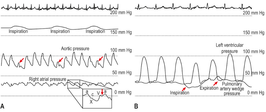 An inspiratory fall in systolic blood pressure exceeding 10 mmHg. It is elicited by inflating the blood pressure cuff to above systolic pressure and noting the peak systolic pressure during expiration. The cuff is then deflated until the clinician can hear the Korotkoff sounds during inspiration and expiration and this pressure value is noted. When a difference between these two pressures of greater than 20 mmHg occurs, pulsus paradoxus is present.