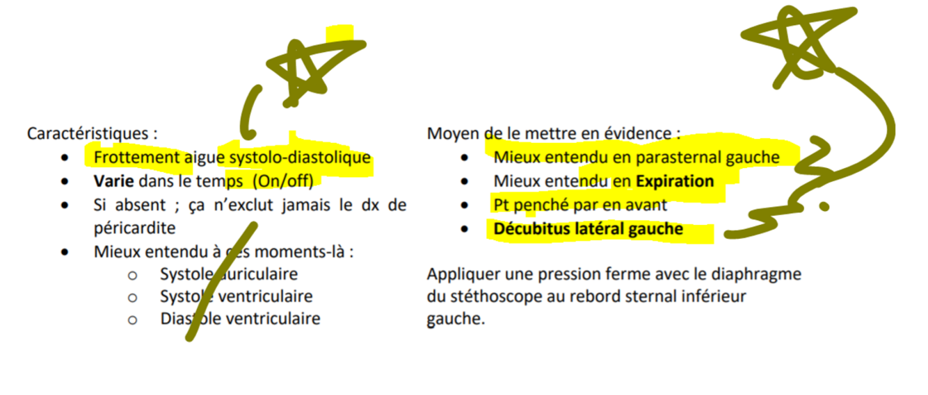 énumère des caractéristiques du frottement péricardique et comment mieux l’entendre