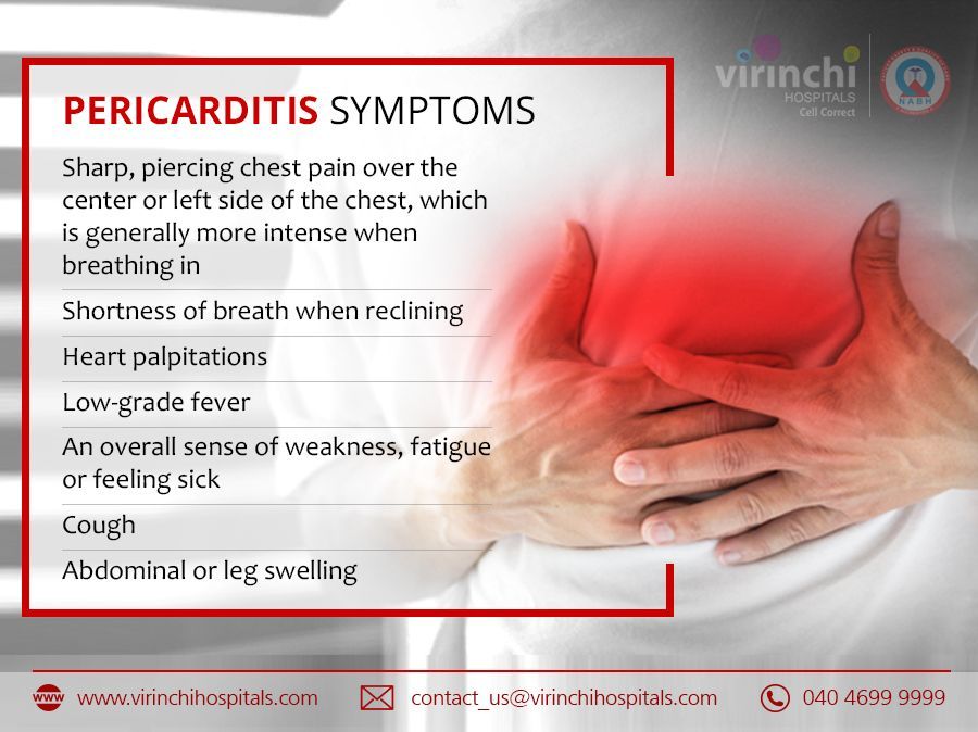chest pain that’s sharp and central, may radiate to neck or shoulders, worse on coughing and deep inspiration, relieved by sitting forward, dyspnoea, nausea.