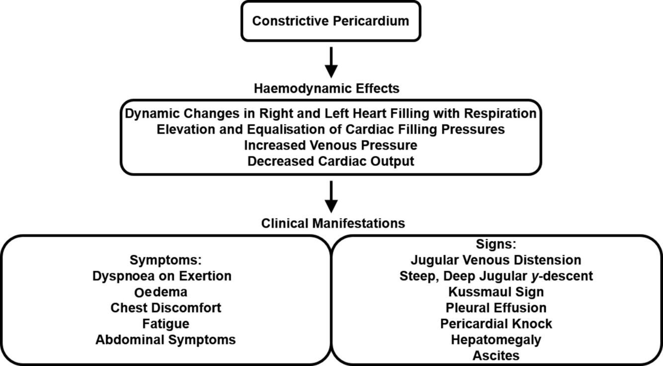 Kussmauls sign, pulsus paradoxus, hepatomegaly, ascites, oedema, pericardial knock, AF.