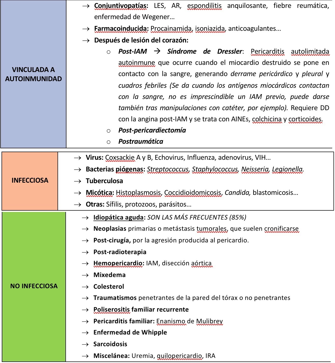 TRATAMIENTO: Etiológico. En ausencia de taponamiento no hay que evacuarlo. Si estamos ante derrame pericárdico crónico masivo podemos recurrir a la pericardiocentesis o la pericardiectomía amplia.