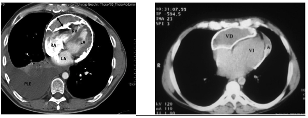 TAC: Es la técnica de elección para confirmar el diagnóstico, ya que no solo nos permite ver el pericardio, sino que en algunos casos de pericarditis podremos ver hasta si existen alteraciones de las arterias coronarias. Podremos ver afectaciones focales o generales del pericardio (lo normal es la alteración global).