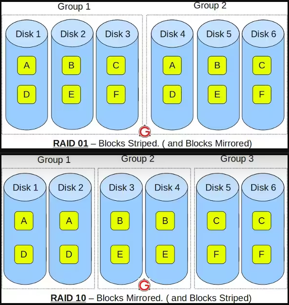 RAID 0+1: primero data striping y luego un mirroning de esos datos formando dos grupos. Pe.: si tenemos dos discos de datos para hacer striping, pondremos dos discos más para el mirroning, dando un total de 4 discos.