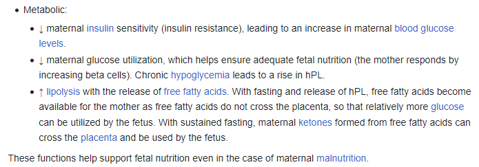 Elle favorise une résistance périphérique a l’insuline chez la mère et stimule la lipolyse de la mère