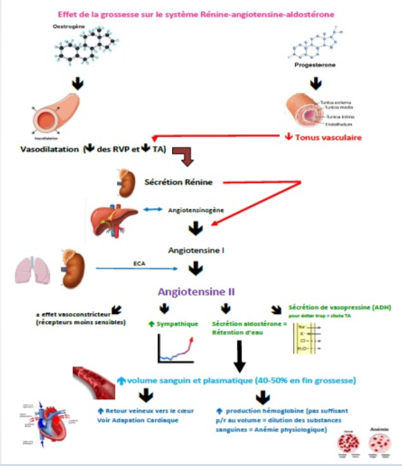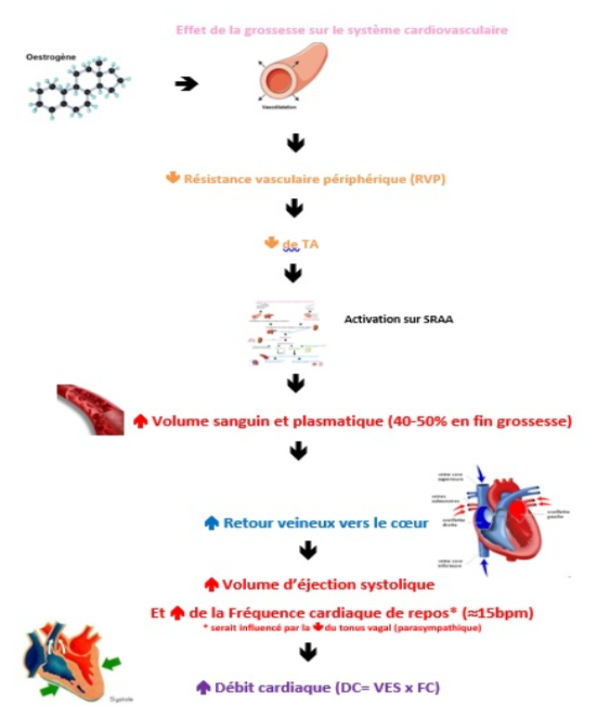 La diminution des résistance vasculaire périphérique, causée par la vasodilatation périphérique (œstrogène) et la diminution du tonus vasculaire (Progestérone), est souvent plus grande au premier et deuxième trimestre que l’augmentation du débit cardiaque