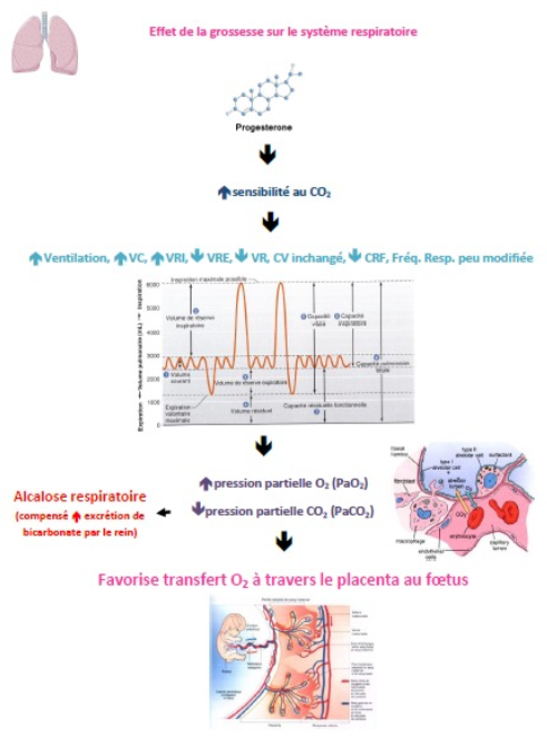 Le système respiratoire se modifie en cours de grossesse. Énumérer en ordre la cascade d’effets physiologiques provoqués par l’augmentation de la progestérone.