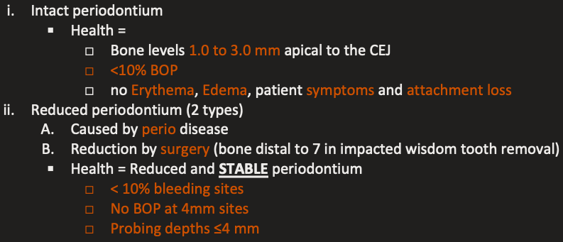 Perio: what are the conditions for periodontal tissues being at health when: