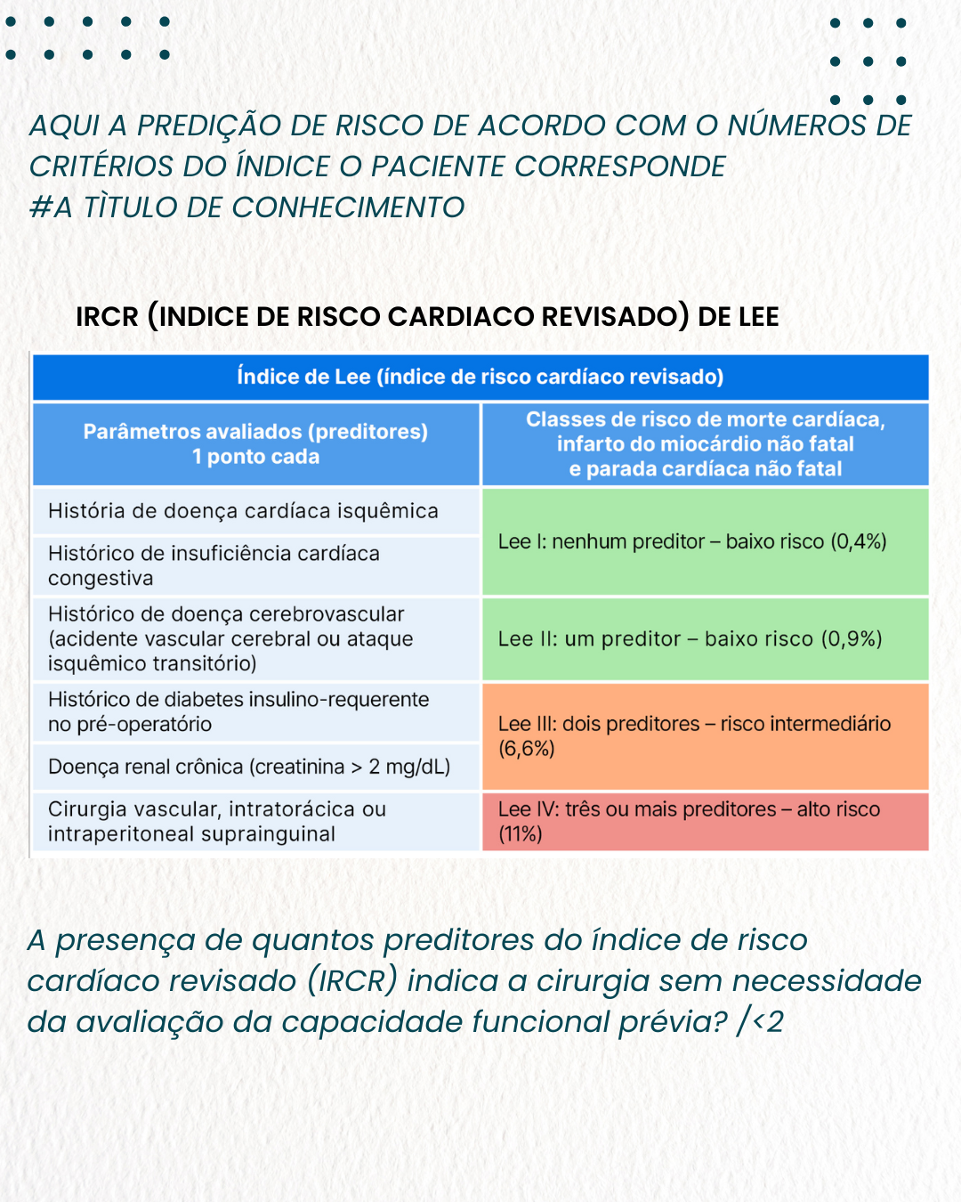 A presença de quantos preditores do índice de risco cardíaco revisado (IRCR) indica a cirurgia sem necessidade da avaliação da capacidade funcional prévia?