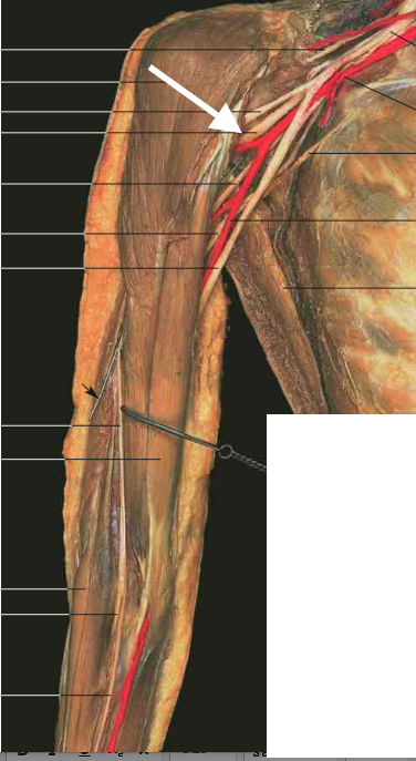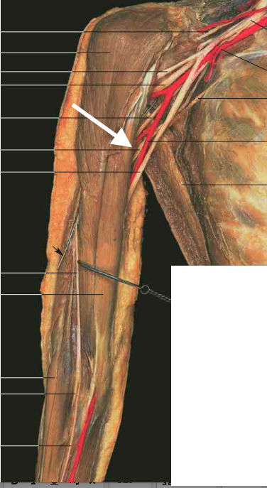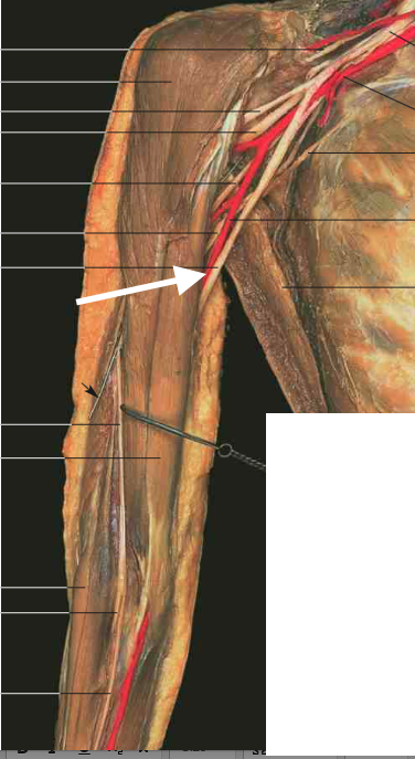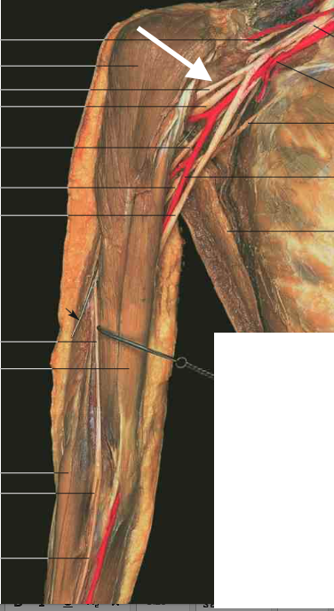 Axillary Nerve. 1. Brachial Plexus. 2. Deltoid. 3. Skin of Shoulder. Branches off with radial nerve and is deep to the M’M nerves.