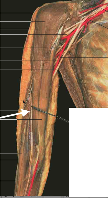 Musculocutaneous Nerve. 1. Brachial Plexus. 2. Brachialis and Biceps Brachii. 3. Lateral Surface of Forearm. 4. paired with Median nerve. anterior to the A & R nerves.