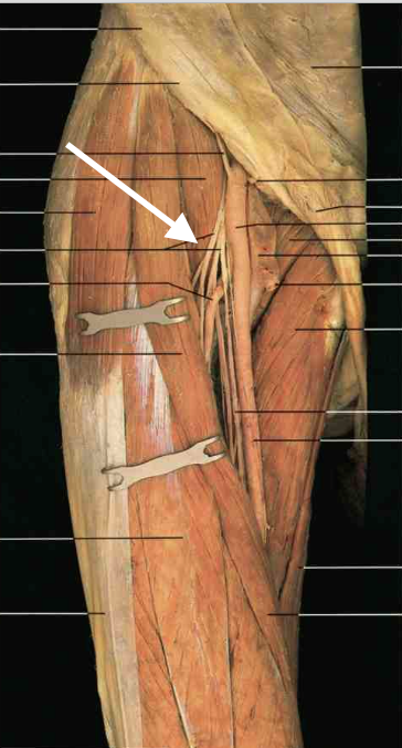 Radial Nerve. 1. Brachial Plexus. 2. triceps, extensor/supinator group. 3. skin of posterior lateral 2/3 of hand. 4. part of the A’R group and bigger than the axillary nerve. runs between the brachialis and brachioradialis.
