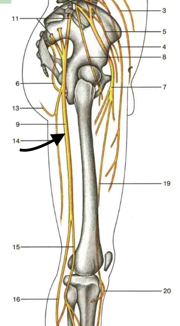 Sciatic Nerve. 1. lumbosacral plexus. 2. hamstrings. 3.? 4. divides into the tibial nerve and common peroneal nerve after hamstring.