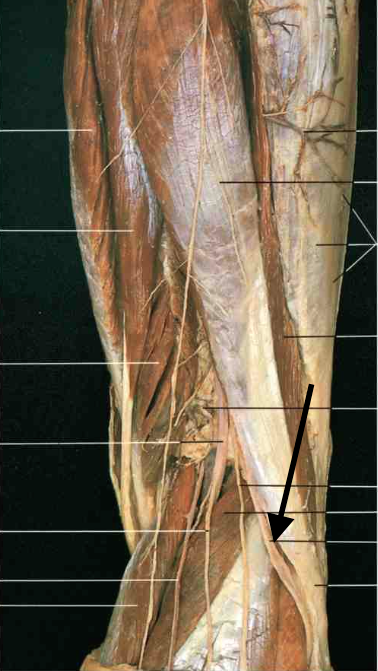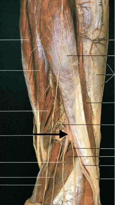 Tibial Nerve. 1. lumbosacral Plexus. 2. gastrocenemius, soleus. 3. posterior lower leg and plantar surface of foot. 4. stays straight after branching from sciatic.