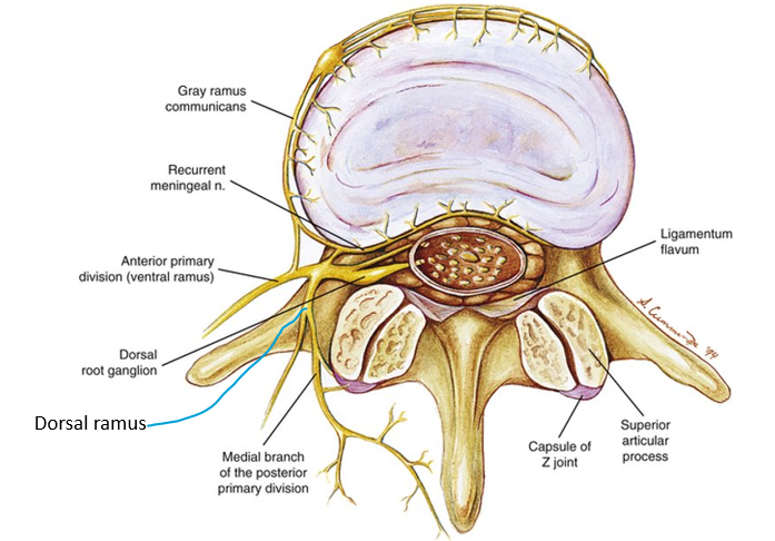 Dorsal: Nerve goes to facet joint and muscle (multifidus) in image