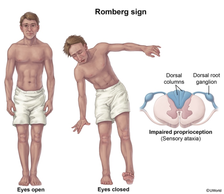 bilateral progressive distal sensory loss, ankle reflexia, high stepping ataxic gait positive Romberg sign (loss of proprioceptive function loss)