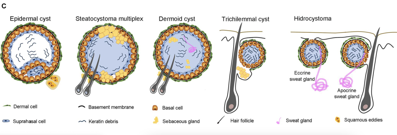 1 - sac filled with fluid or other material lined by epithelial cells