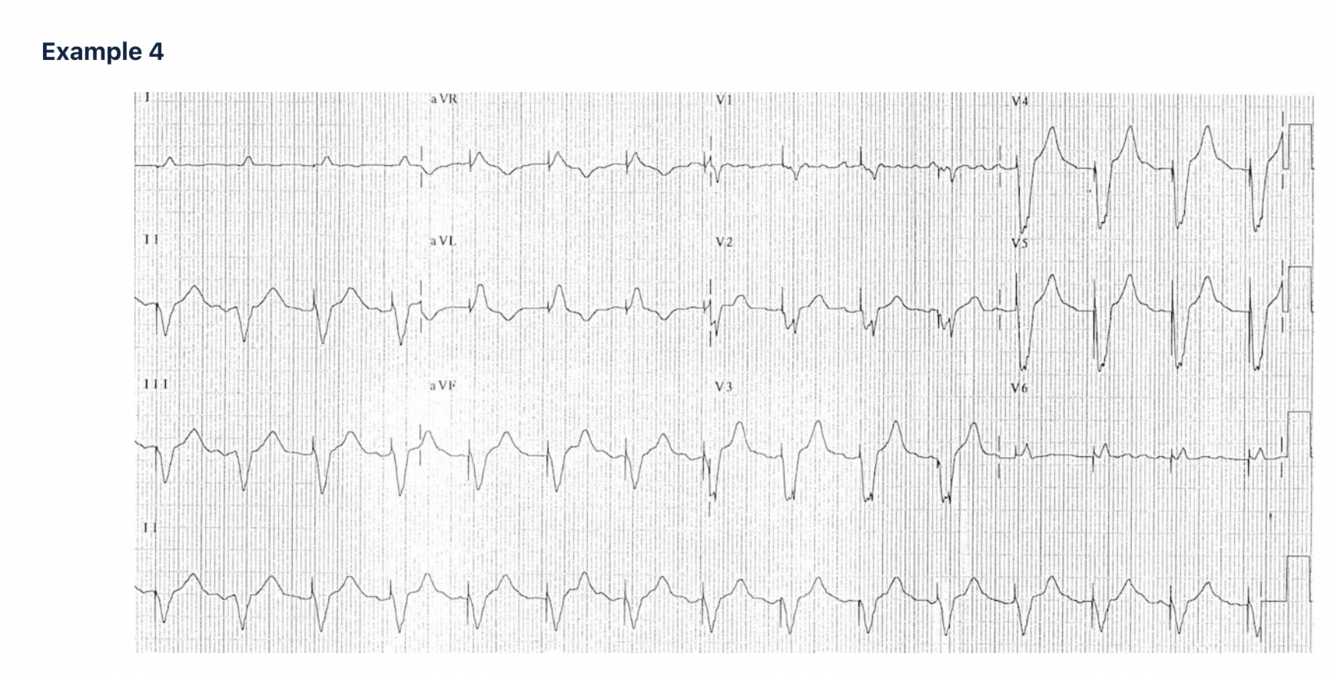 ST segments and T waves discordant with the QRS complex