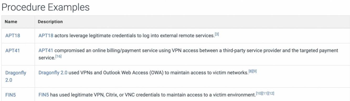 Looking at historic examples of adversaries using this technique we can see that APT18, APT41, Dragonfly 2.0 and FIN5 have all reused valid credentials to maintain access to a target network using remote services such as VPNs and Outlook Web Access.