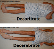 Decorticate (Damage above red nucleus): arms adducted and flexed, legs internally rotated and plantar flexed