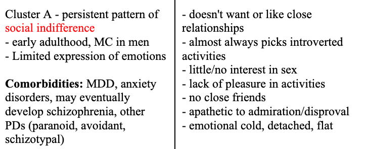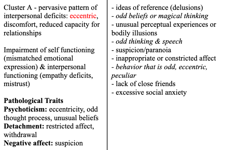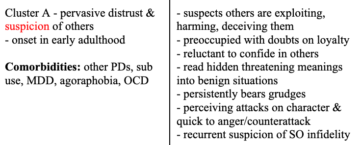 List the 3 cluster A personality disorders and what quality they are characterized by