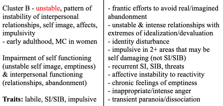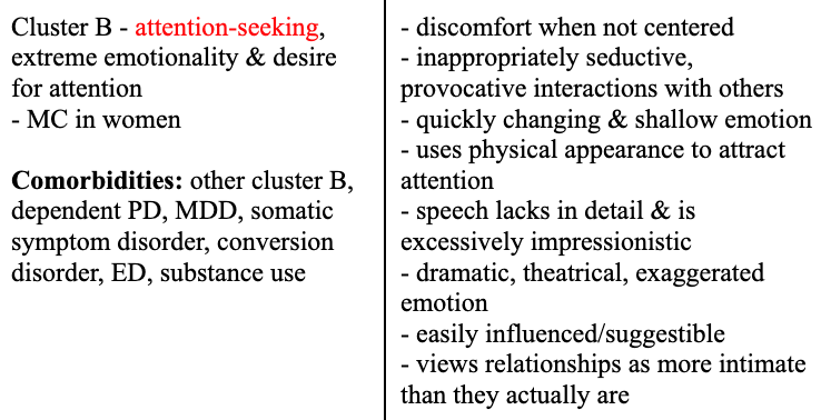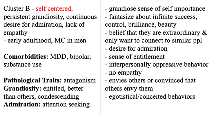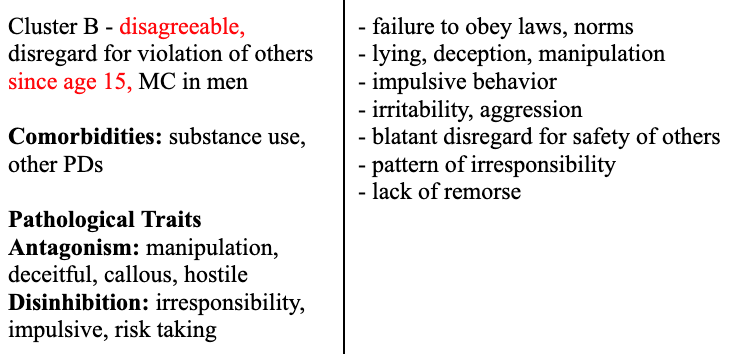 List the 4 cluster B personality disorders and what quality they are characterized by