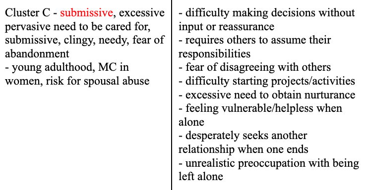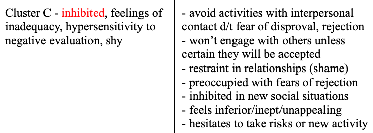 List the 3 cluster C personality disorders and what quality they are characterized by